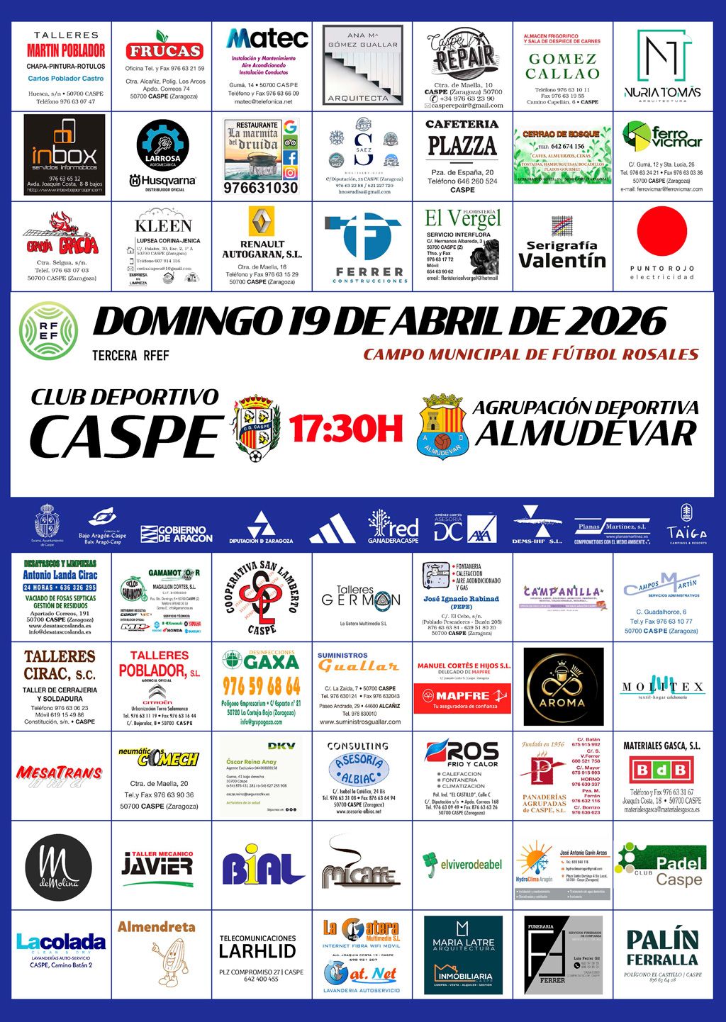 • Fútbol C.D. Caspe. El jueves 19 abril a las 17:30 horas en el Campo Municipal de Fútbol Rosales. Tercera RFEF.  C.D. Caspe – Almudevar