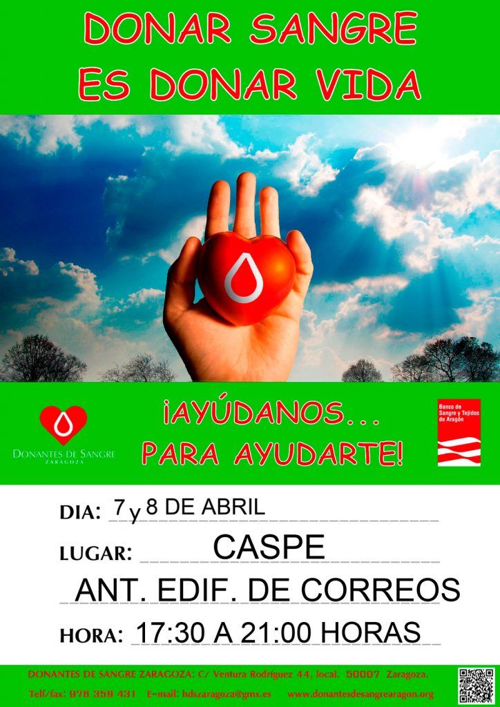 • Donantes de Sangre Zaragoza – Extracción de Sangre en Caspe. Desde Donantes de Sangre de Zaragoza se ponen en contacto con nosotros para informarnos de los días, el lugar y la hora que se desplazará a Caspe una Unidad Móvil al objeto de proceder a una masiva Extracción de Sangre.