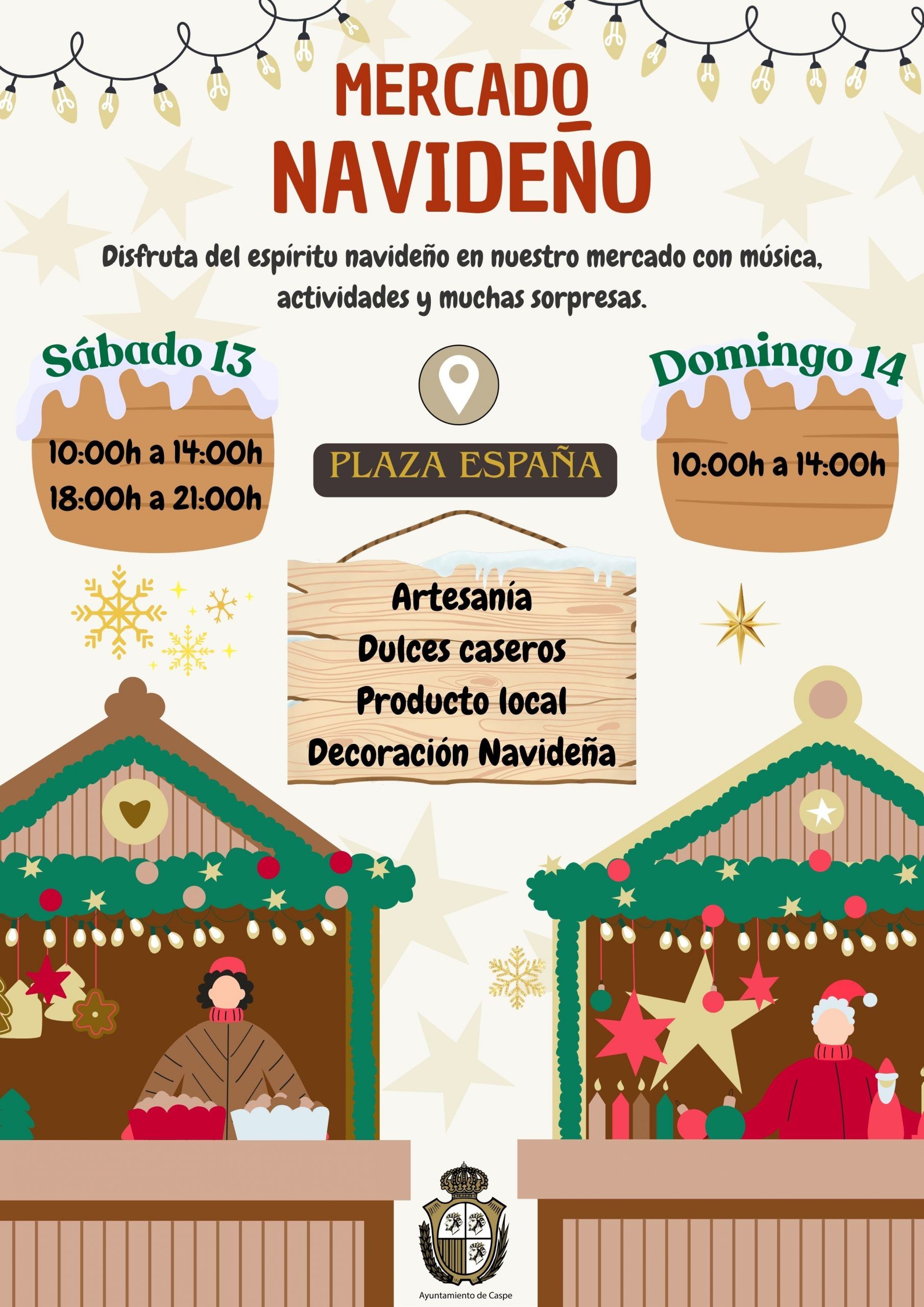 Los próximos días 13 y 14 de diciembre, la plaza de España y la calle Mayor se llenará de magia con la celebración del II Mercado Navideño organizado por el Ayuntamiento de Caspe.