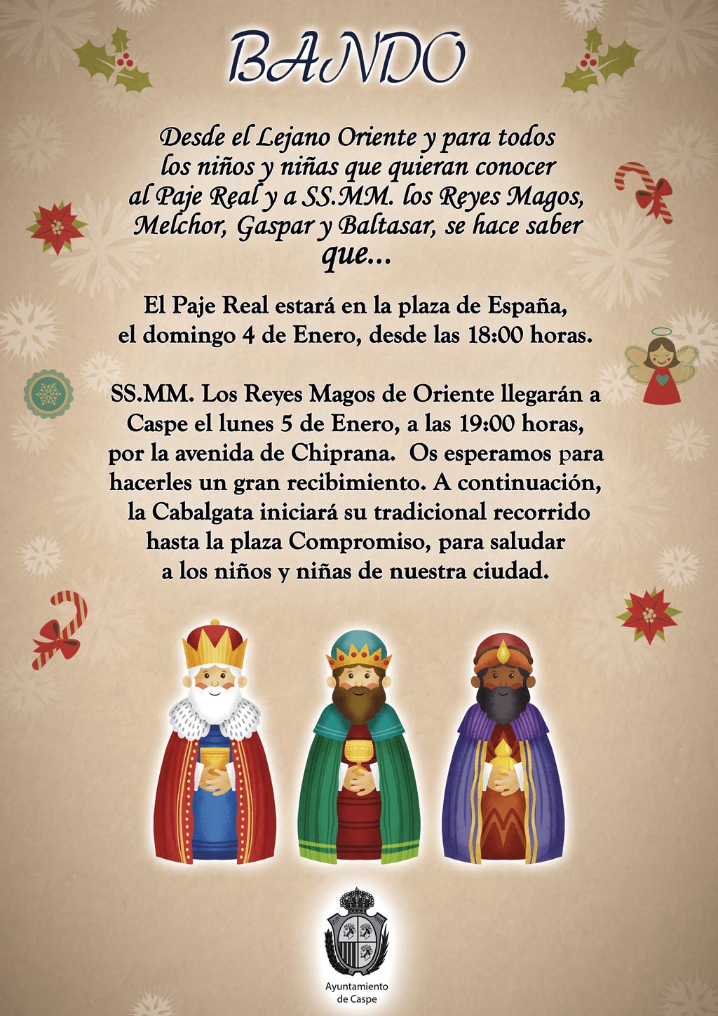 SS.MM. los Reyes Magos de Oriente llegarán a Caspe el lunes 5 de enero a las 19:00 horas por la avenida de Chiprana.