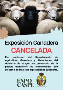 El Ayuntamiento de Caspe comunica que, por resolución del Departamento de Agricultura, Ganadería y Alimentación del Gobierno de Aragón, en vista de los recientes casos de enfermedades que pueden afectar a los animales de explotaciones ganaderas, se han revocado todas las autorizaciones para realizar exposiciones ganaderas en ferias, concursos, certámenes, romerías, mercados y cualquier evento de carácter temporal.