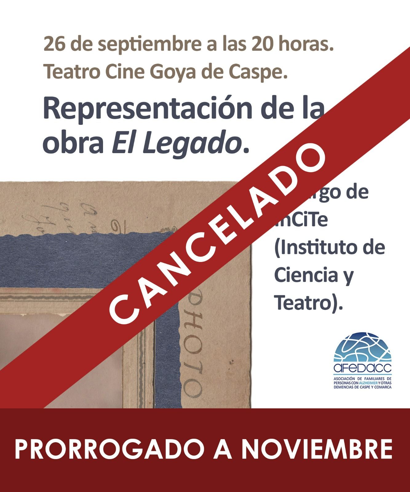 Desde AFEDACC nos informan que, por motivos ajenos a la organización, se cancela la representación de la obra de teatro “El Legado” programada para el próximo jueves día 26 de septiembre y, del mismo modo, nos indican que la actividad se pospone para el mes de noviembre.