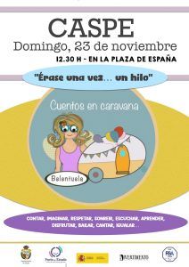 Belentuela vive en una caravana mágica llena de libros, música, lápices de colores, ideas, alegría…Vive como viven las hadas. Cuenta cuentos desde su caravana y estará encantada de que los niños y niñas de Caspe paséis a verla, a escucharla y a participar.