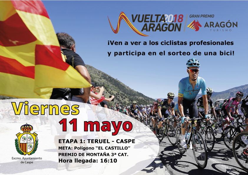 El viernes, día 11 de mayo, la Vuelta Aragón 2018 llegará a nuestra ciudad. Caspe acogerá el final de la primera etapa de esta ronda aragonesa que puede ser determinante para la clasificación final.