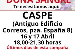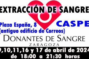 Desde Donantes de Sangre de Zaragoza se ponen en contacto con nosotros para informarnos de los días, el lugar y la hora que se desplazará a Caspe una Unidad...