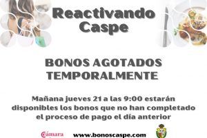 El área de Comercio del Ayuntamiento de Caspe comunica que se han agotado, temporalmente, los bonos de la campaña “Reactivando Caspe”. Mañana jueves 21 de...