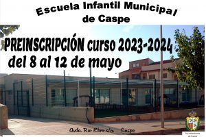 El periodo de preinscripción en la Escuela Infantil Municipal de Caspe, curso 2023-2024, será del 8 al 12 de mayo de 2023. La información y documentación...