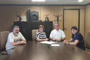 La alcaldesa de Caspe, Pilar Mustieles y Rafael Lumbreras, concejal del Área de Cultura del Ayuntamiento se han reunido con Joaquín Royo, presidente de la...