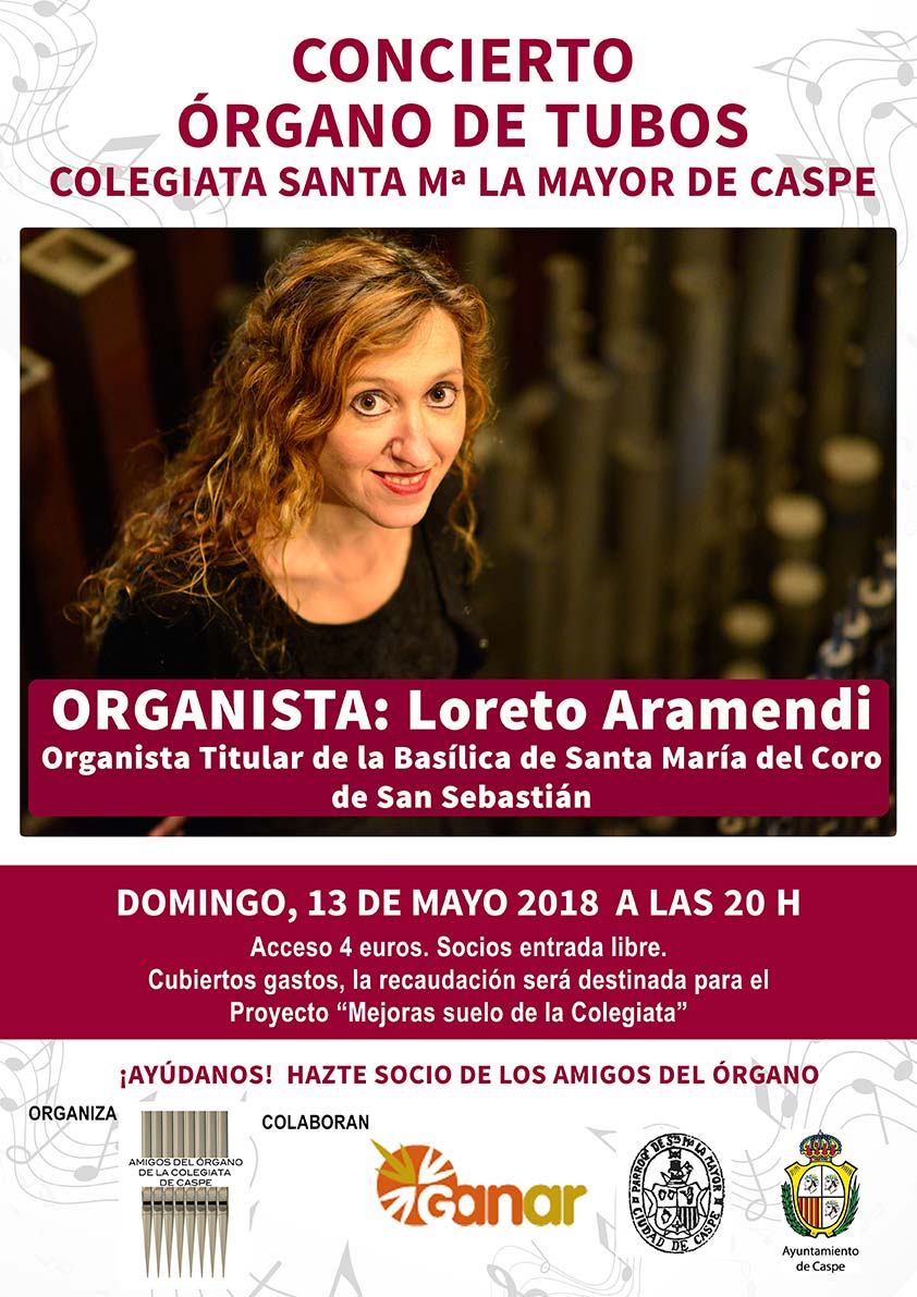 CARTEL-ORGANO-DE-TUBOS--Loreto-AramendiDomingo 13 de mayo a las 20h concierto del Órgano de tubos en la Colegiata Santa María la Mayor, a cargo de Loreto Aramendi, Organista Titular de la Basílica de Santa María del Coro de San Sebastián.