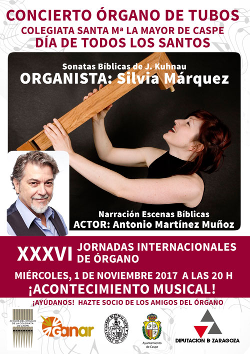 El día 1 DE NOVIEMBRE, festividad de Todos los Santos, incluido dentro de las XXXVI JORNADAS INTERNACIONALES DE ÓRGANO programadas por la DPZ, tenemos el placer de recibir en nuestra Colegiata a la organista aragonesa SILVIA MÁRQUEZ y al actor ANTONIO MARTÍNEZ MUÑOZ.