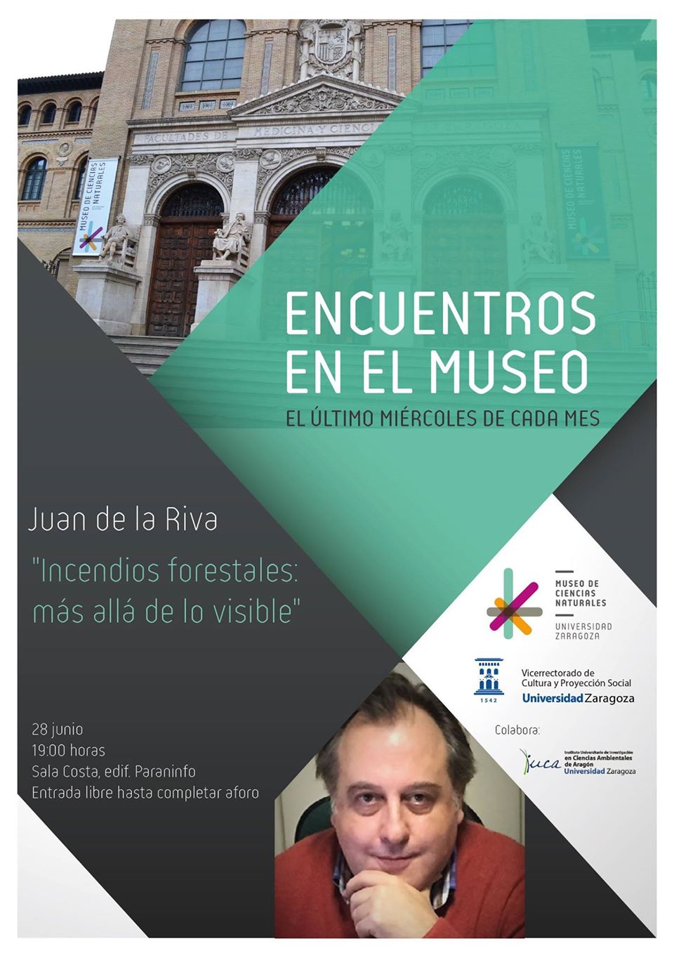 El miércoles, 28 de junio, a las 19:00 horas en la Sala Costa del edificio Paraninfo de Zaragoza y con entrada libre hasta completar aforo, Juan de la Riva dará una conferencia sobre “Incendios forestales: más allá de lo visible”
