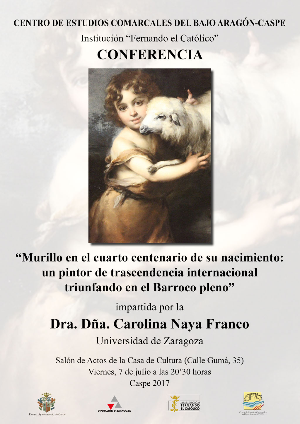 El viernes 7 de julio, a las 20:30 horas en el Salón de Actos de la Casa de Cultura, Carolina Naya Franco impartirá la conferencia “Murillo en el cuarto centenario de su nacimiento: un pintor de trascendencia internacional triunfando en el Barroco pleno”, organizado por el Centro de Estudios Comarcales del Bajo Aragón Caspe.