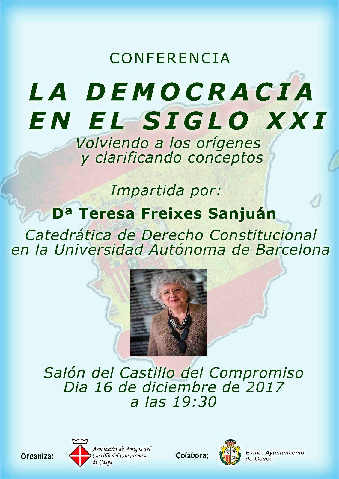 Conferencia de Dña. Teresa Freixes,Catedrática de Derecho Constitucional. el Sábado día 16 a las 19:30 titulada “La democracia en el siglo XXI, Volviendo a los orígenes y clarificando conceptos”. Organizada por Asociación de amigos del Castillo del Compromiso de Caspe.
