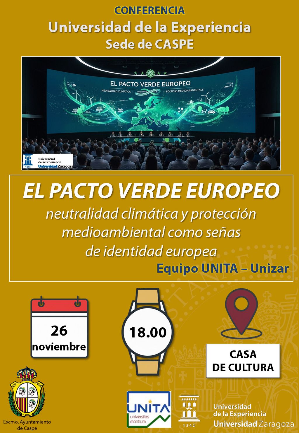 El Área de Educación del Ayuntamiento de Caspe, dentro del marco de la Universidad de la Experiencia de Caspe (UEZ), ofrece la conferencia El Pacto Verde Europeo: la neutralidad climática y la protección medioambiental como señas de identidad europea impartida por Equipo UNITA-Unizar.
