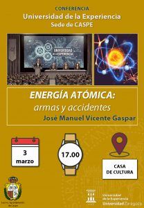 El Área de Educación del Ayuntamiento de Caspe, dentro del marco de la Universidad de la Experiencia -UEZ- de Caspe, ofrece la conferencia que lleva por título “Energía atómica: armas y accidentes” impartida por D. José Manuel Vicente Gaspar, profesor del Centro Universitario de la Defensa de la Universidad de Zaragoza.