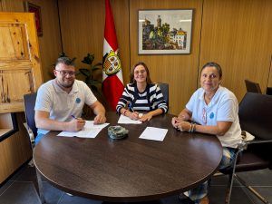 El Ayuntamiento de Caspe, representado por la alcaldesa Ana Mª Jarque, junto al presidente de la Asociación Profesional de Empresarios de Caspe y Comarca (APEC), Ramón Martínez y Cristina Bret han formalizado el convenio de colaboración por el que esta entidad les otorga una subvención de 3.500 euros destinada a las actividades del ejercicio 2025.