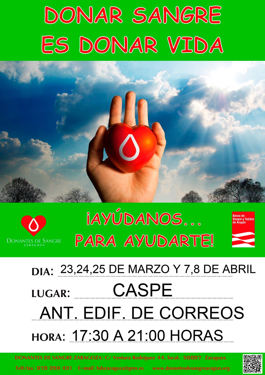 Desde Donantes de Sangre de Zaragoza se ponen en contacto con nosotros para informarnos de los días, el lugar y la hora que se desplazará a Caspe una Unidad Móvil al objeto de proceder a una masiva Extracción de Sangre.