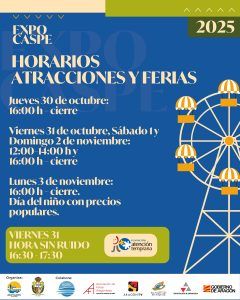 El Ayuntamiento de Caspe en colaboración con la Asociación de Feriantes y por iniciativa de la Fundación Atención Temprana, con el objetivo de avanzar en la inclusión e integración de toda la ciudadanía, comunica que, en el espacio dedicado a las atracciones feriales, se ha programado una hora sin ruido, el viernes 31 de octubre de 16:30 a 17:30 horas.