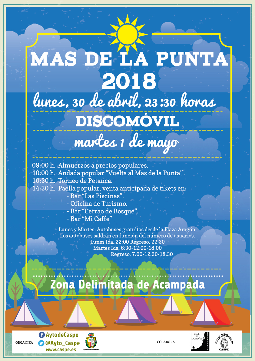 El Lunes 30 de abril por la noche comenzará la celebración con Discomovil y ya el martes desde las nueve de la mañana habrá diversas actividades como un almuerzo a base de huevos fritos organizado por UGT, andada popular organizada por el Club de Montaña Zalagarda, torneo de petanca organizado por el Club de Petanca de Caspe y paella popular.