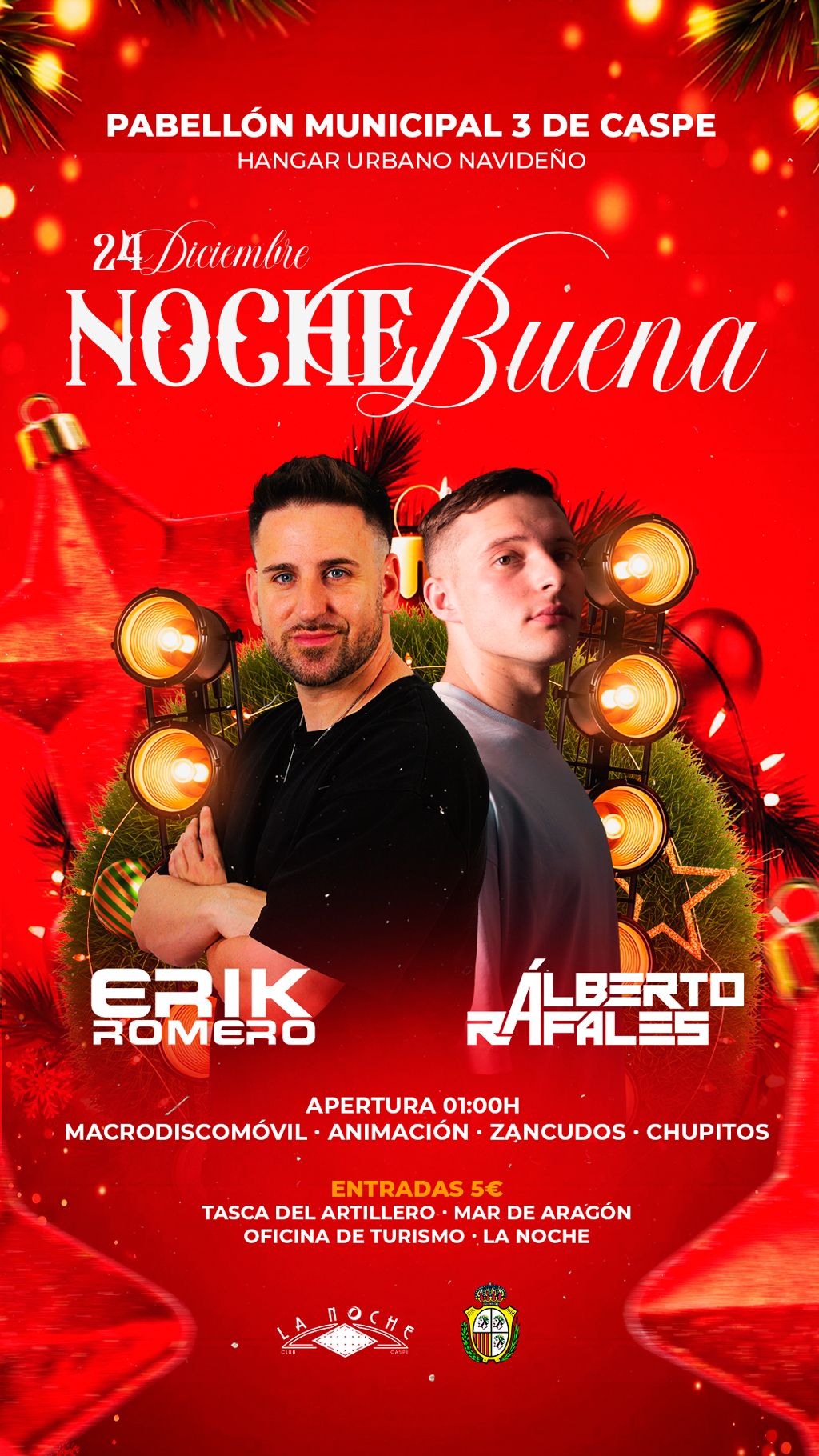 ¡Ven a nuestro Hangar Urbano Navideño de la Fiesta de Nochebuena de Caspe! Un evento organizado por el área de Festejos del Ayuntamiento de Caspe que contará con la actuación de los Djs “Erick Romero” y “Alberto Ráfales”.