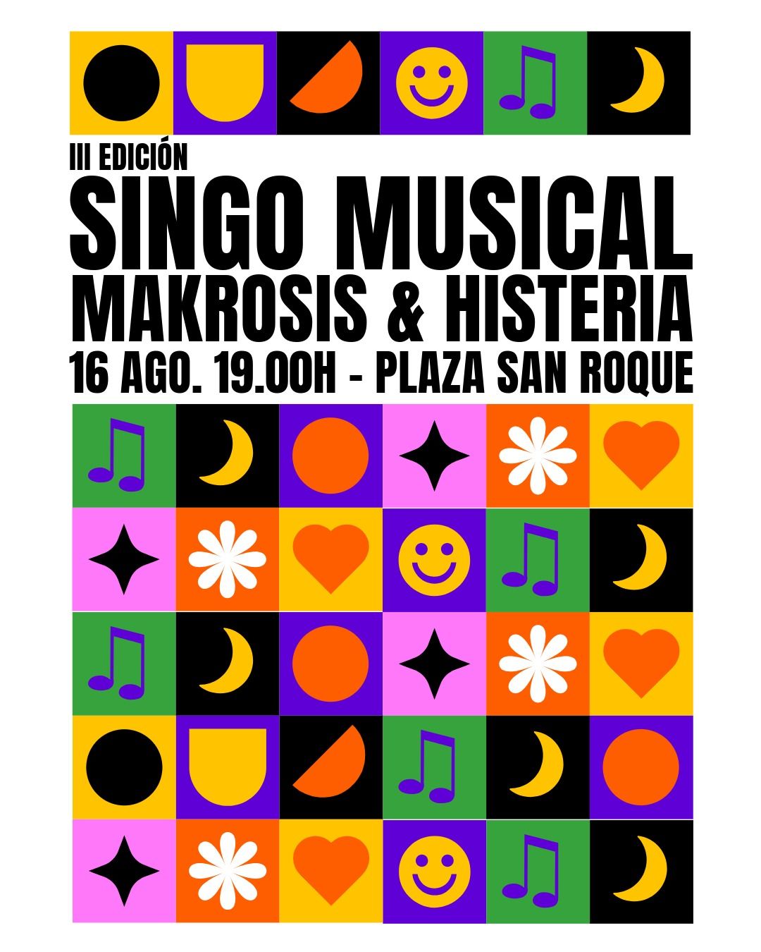 El sábado 16 de agosto a las 19:00 horas en la plaza de San Roque, organizado por Interpeñas con la colaboración de las peñas Makrosis & Histeria, tendremos la III edición del Singo Musical.