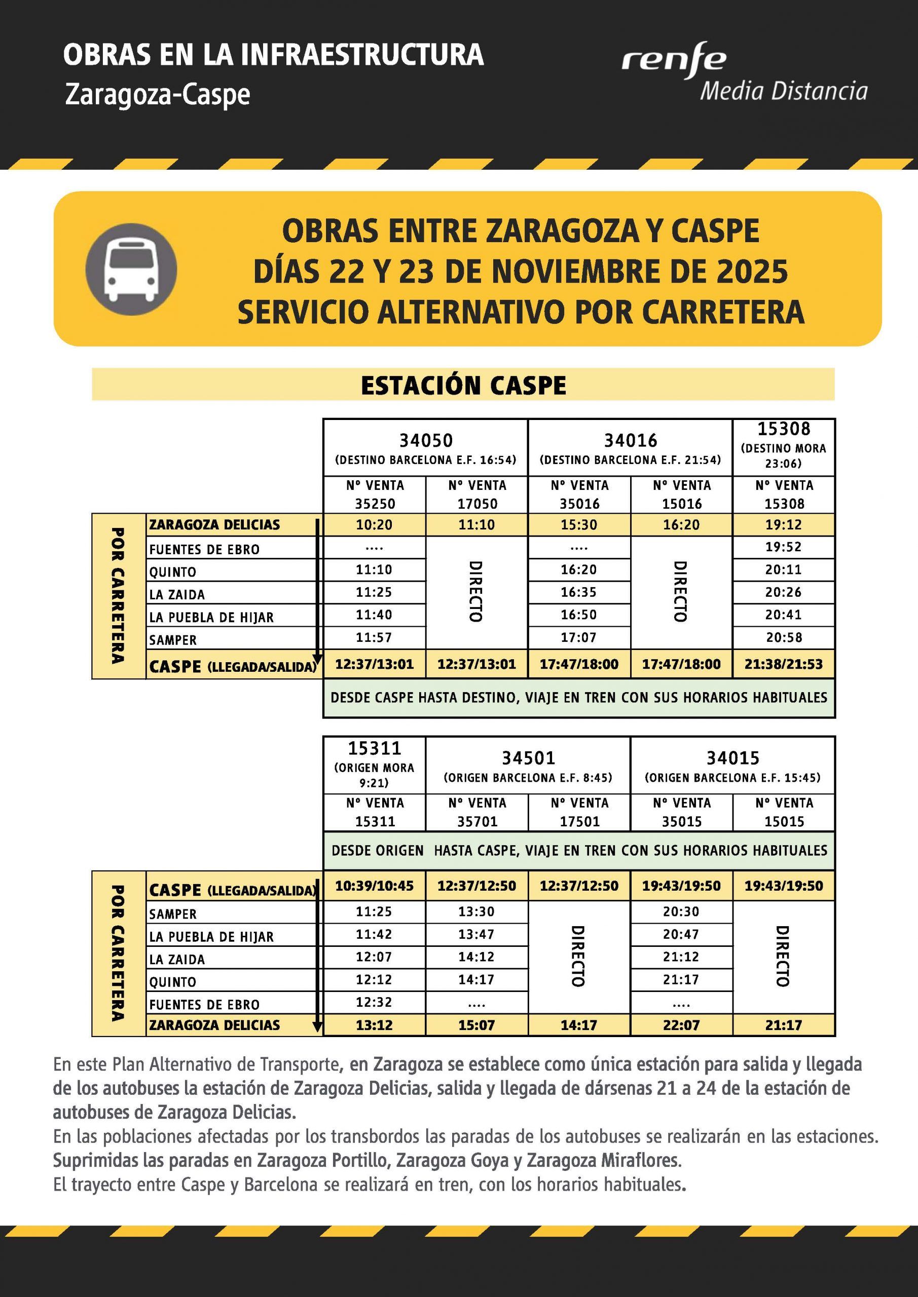 Renfe comunica los horarios del Plan Alternativo por carretera previsto para los días 22 y 23 de noviembre con motivo de las obras en la infraestructura ferroviaria entre Zaragoza y Caspe.