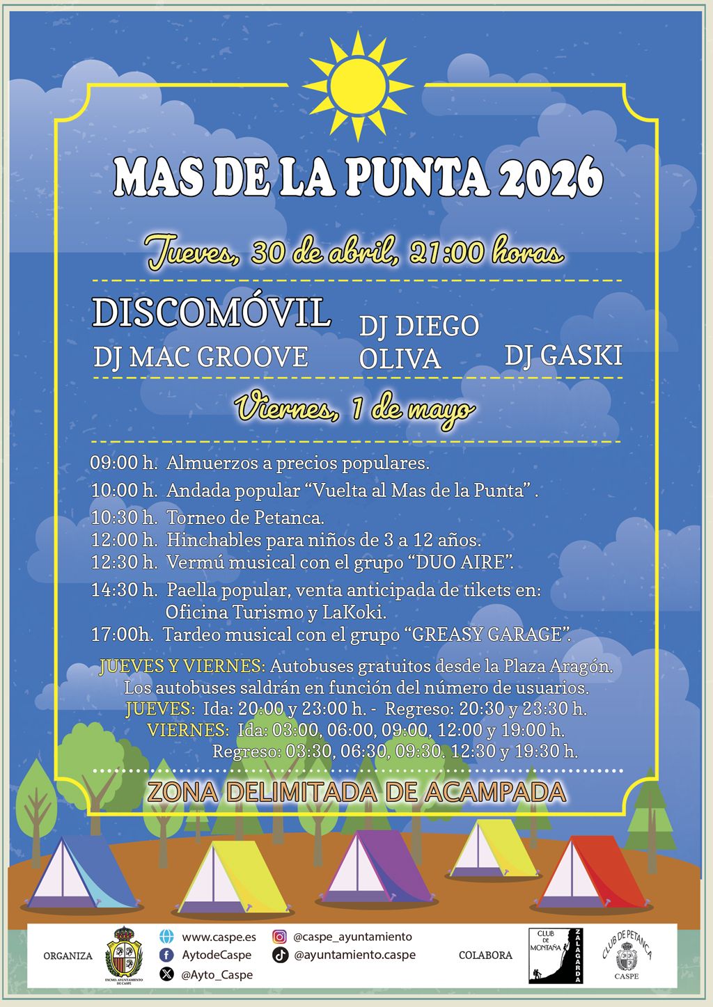 El área de Festejos del Ayuntamiento de Caspe con motivo de la fiesta popular del 1 de mayo organiza el programa de actividades “Mas de la Punta 2026”. Los actos se van a desarrollar junto al Mar de Aragón, en el paraje natural Mas de la Punta.