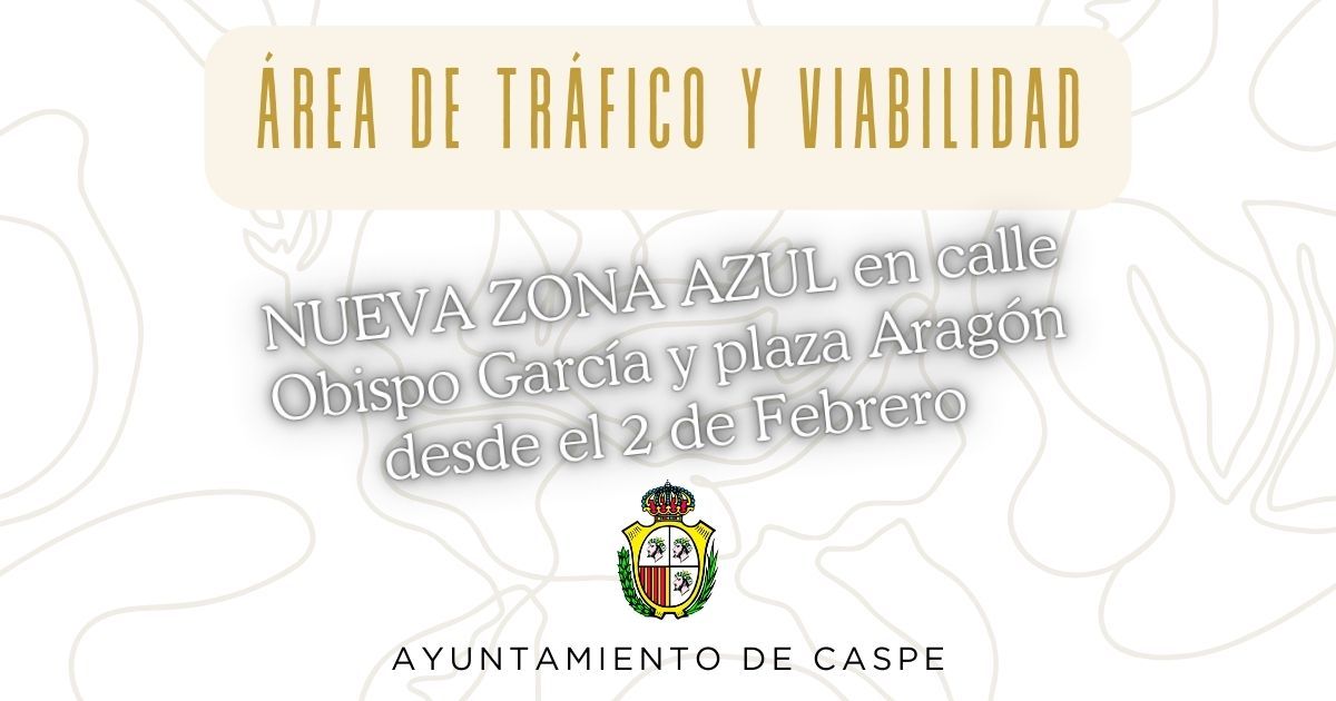 El área de Tráfico y Viabilidad del Ayuntamiento de Caspe comunica que a partir del próximo 2 de febrero de 2026 se pondrá en marcha la nueva zona azul de la calle Obispo García y la Plaza Aragón.