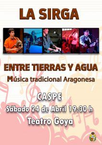 • Y el sábado 24 de abril a las 19.30 horas en el Teatro Goya, el Grupo La Sirga, interpretará el espectáculo “Entre tierras y agua”, en el que nos adentraremos, en el conocimiento de la música tradicional de las comarcas aragonesas más orientales.