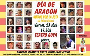 • Por la tarde, a las 17.30 horas, en el Teatro Goya, tendrá lugar un Festival de Folclore Aragonés, a cargo de la A.C. Rondalla Compromiso de Caspe. En el festival, que se interpretarán distintas jotas de todo el territorio aragonés, con el fin de poner en valor la diversidad del territorio.
