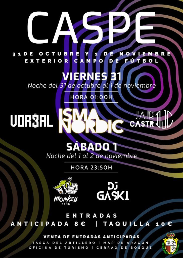Además, desde el área de Festejos del Ayuntamiento de Caspe, las noches del viernes 31 de octubre y sábado 1 de noviembre, se ofrecerá un atractivo programa musical en el exterior del campo de fútbol “Los Rosales”, con actuaciones dirigidas a todos los públicos: