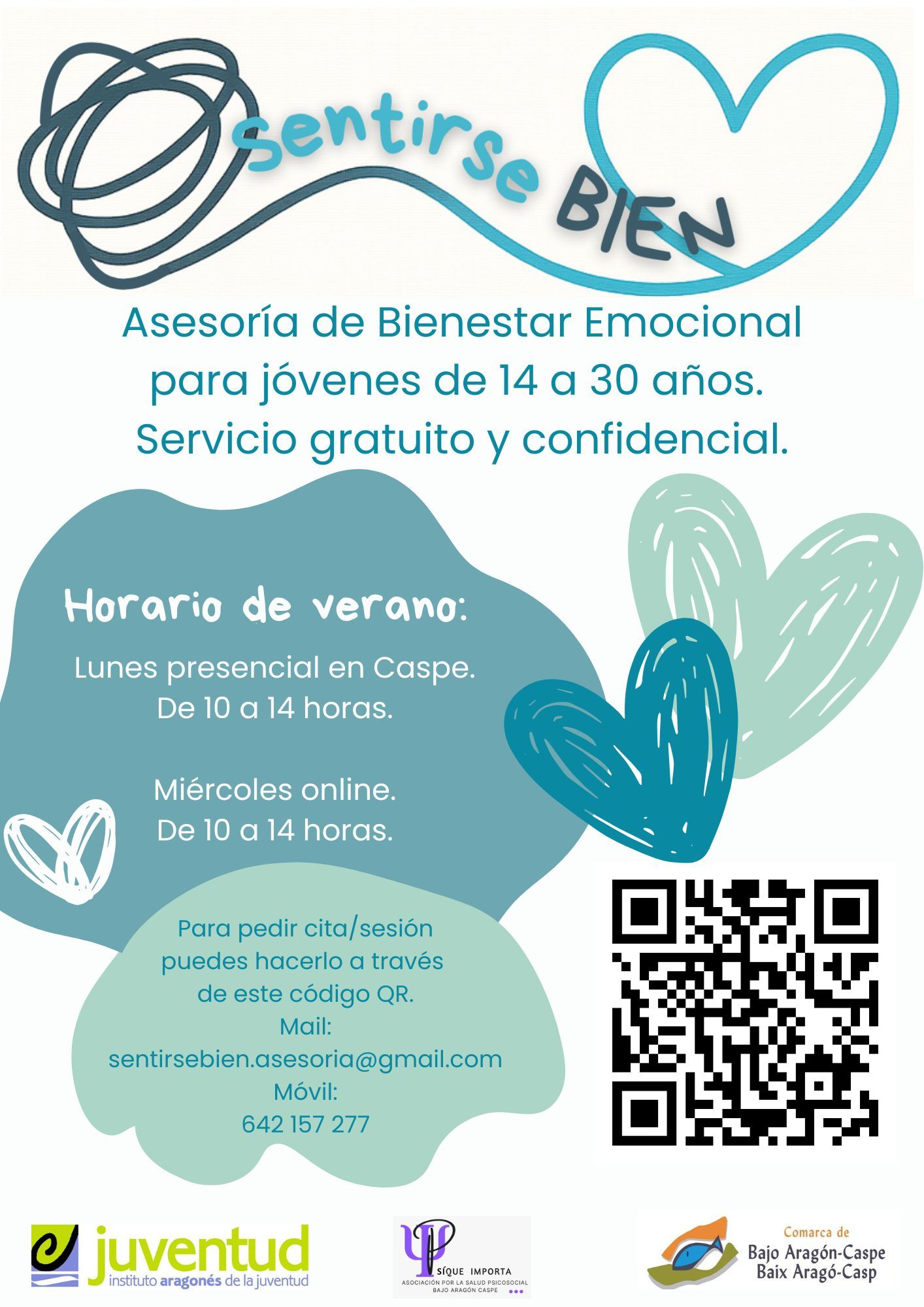 Desde la Comarca del Bajo Aragón-Caspe/Baix Aragó-Casp se pone en marcha el nuevo servicio comarcal “Sentirse Bien”, un proyecto de apoyo emocional y prevención en salud mental dirigido a jóvenes de entre 14 y 30 años. La iniciativa está impulsada por el Instituto Aragonés de la Juventud (IAJ) y responde a la creciente necesidad de atención psicológica entre la juventud, especialmente en las zonas rurales.