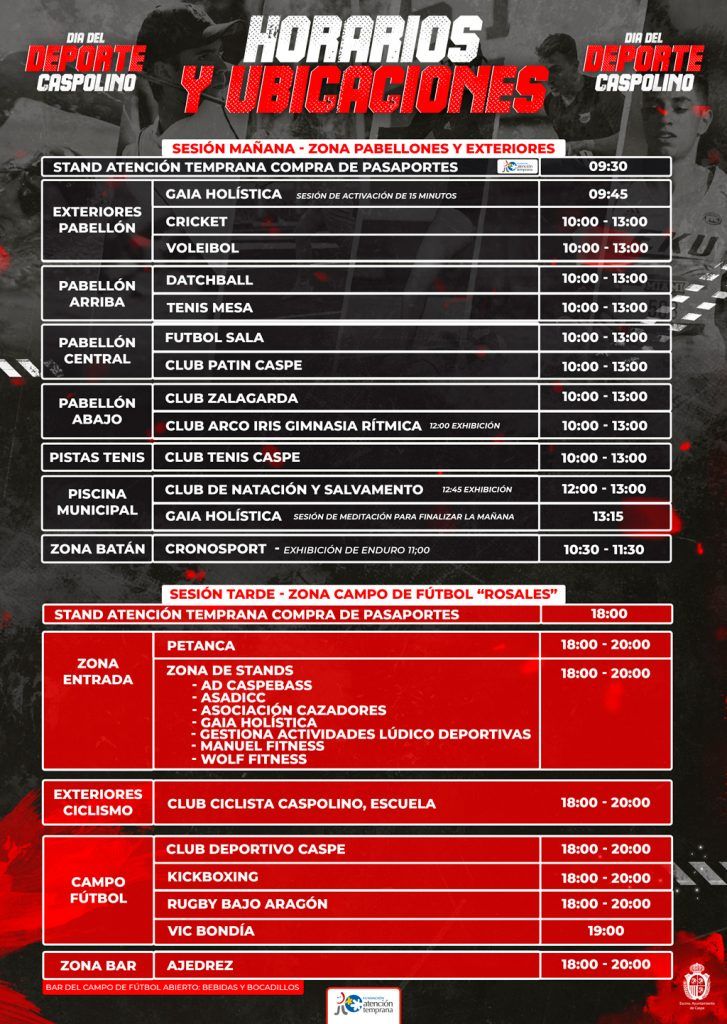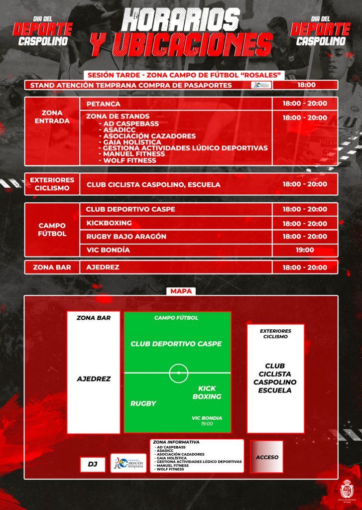 Club de Petanca, Club Ciclista Caspolino, Club Kickboxing, Rugby Bajo Aragón, Vic Bondía y Club de Ajedrez. En la zona informativa se contará con: AD Caspe Bass, la Asociación de Cazadores, ASADICC, Gaia Holística, Gestiona Actividades Lúdico Deportivas, Manuel Fitness y Wolf Fitness.