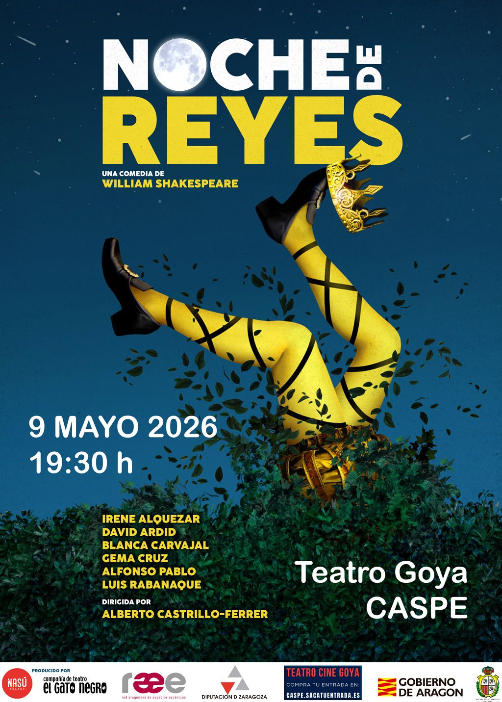 El sábado, 9 de mayo de 2026, a las 19:30 horas, en el Teatro Goya de Caspe, podremos disfrutar del espectáculo teatral “Noche de Reyes”, una comedia de William Shakespeare de Nasú y El Gato Negro Producciones. La representación teatral que ha sido programada por el área de Cultura del Ayuntamiento de Caspe y forma parte de Red Aragonesa de Espacios Escénicos.