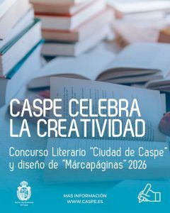 El Ayuntamiento de Caspe, a través del área de Cultura, convoca la XX edición del concurso literario de relato corto “Ciudad de Caspe” de ámbito autonómico y la XI edición del concurso “Marcapáginas” de ámbito local.